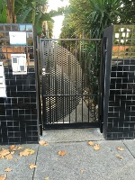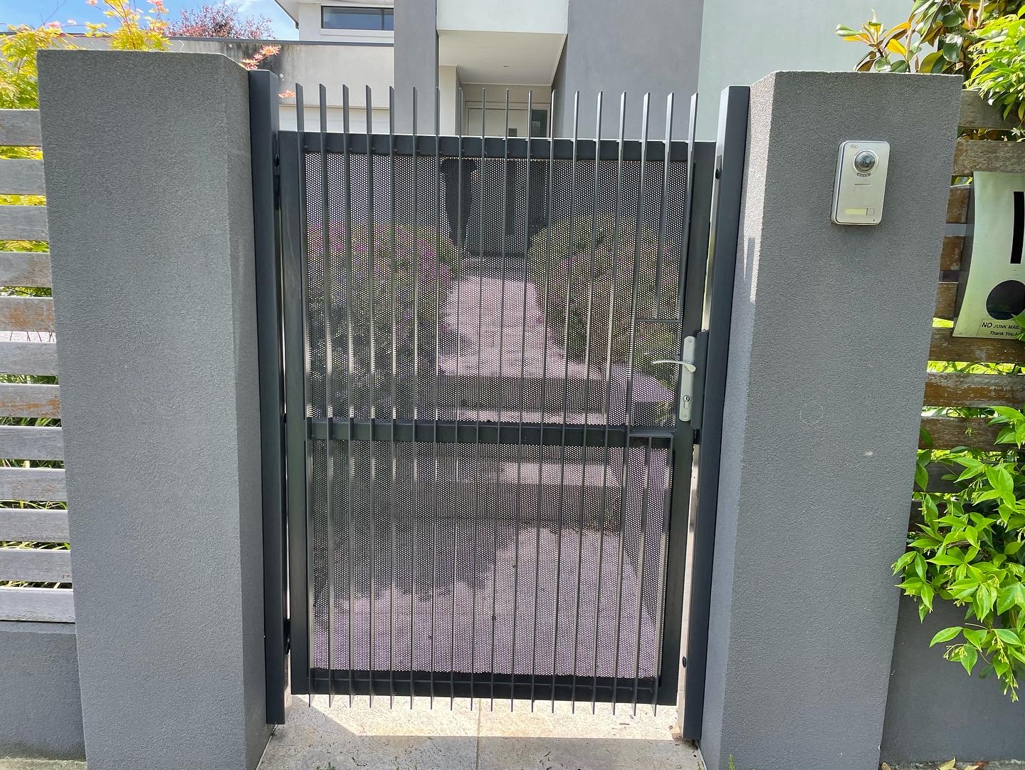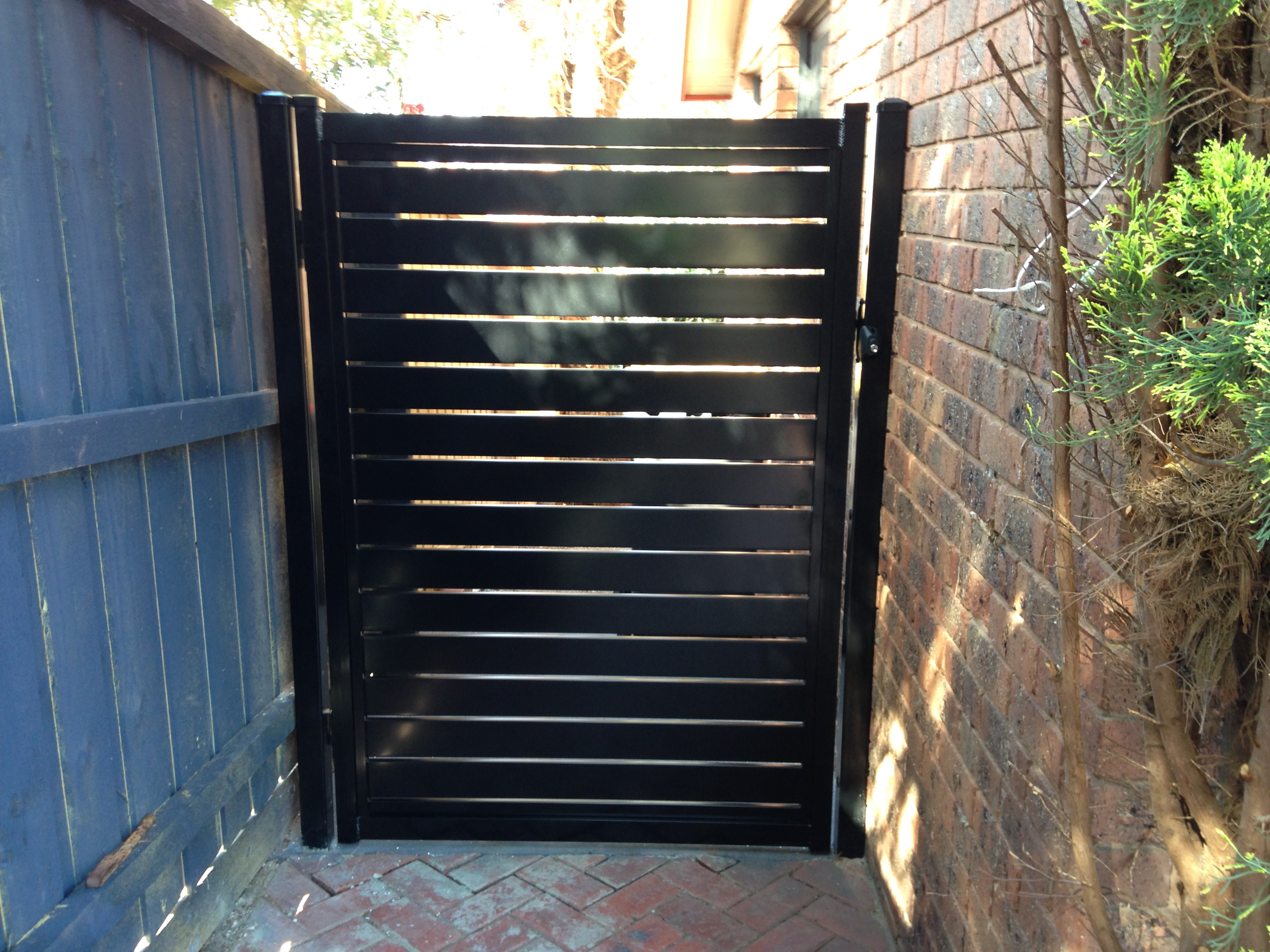 Blade gate with perf sheet powder coated black with key access
