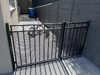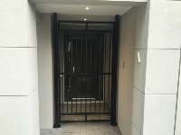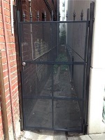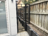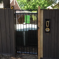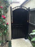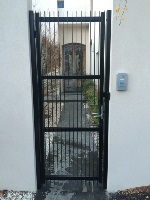 Vertical pine single access gate with powder coated black frame and single key entry.