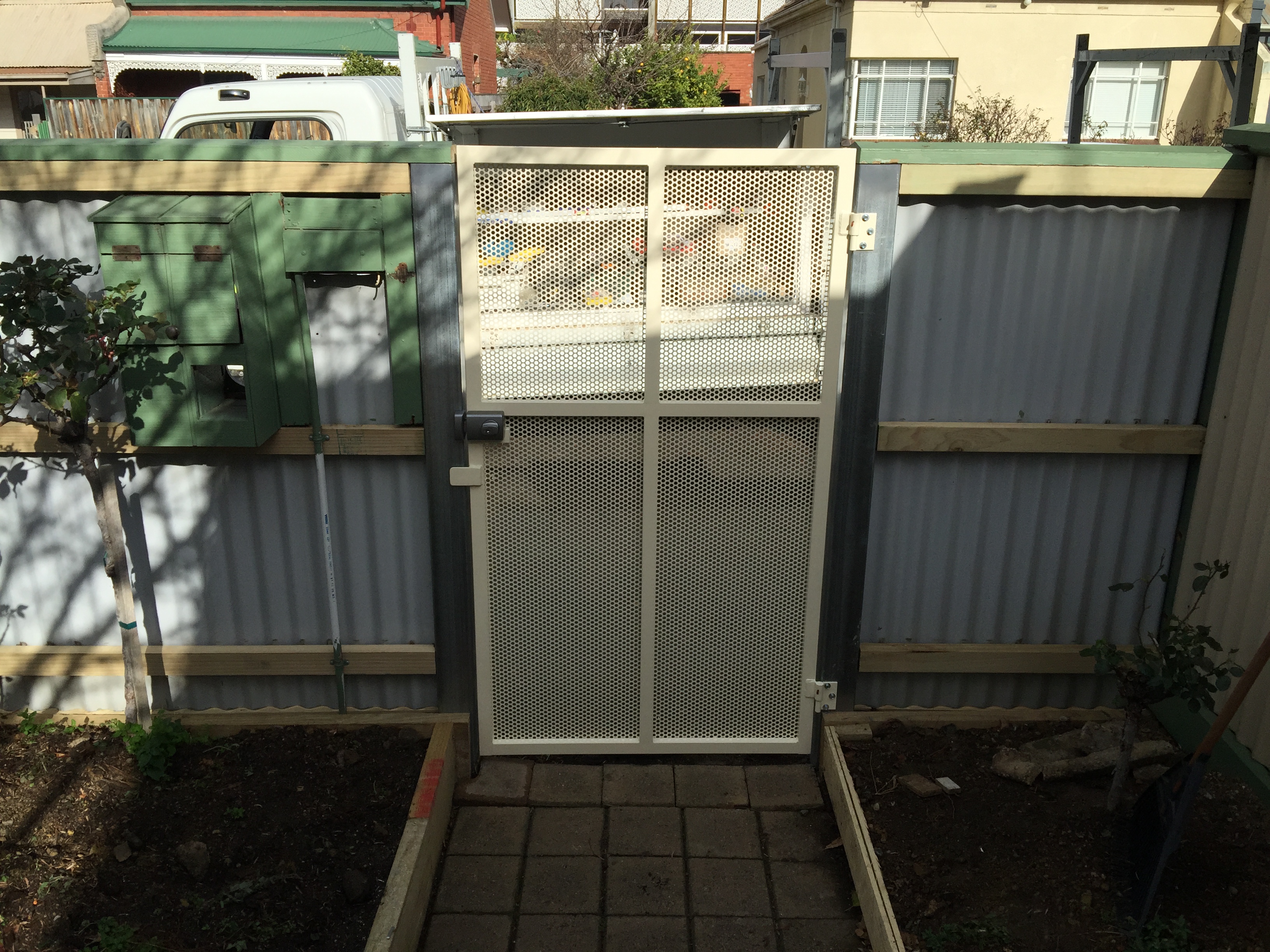Colourbond single access gate set on posts with key access entry