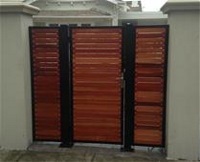 Tall vertical gate with merbau timber with powder coated steel frame